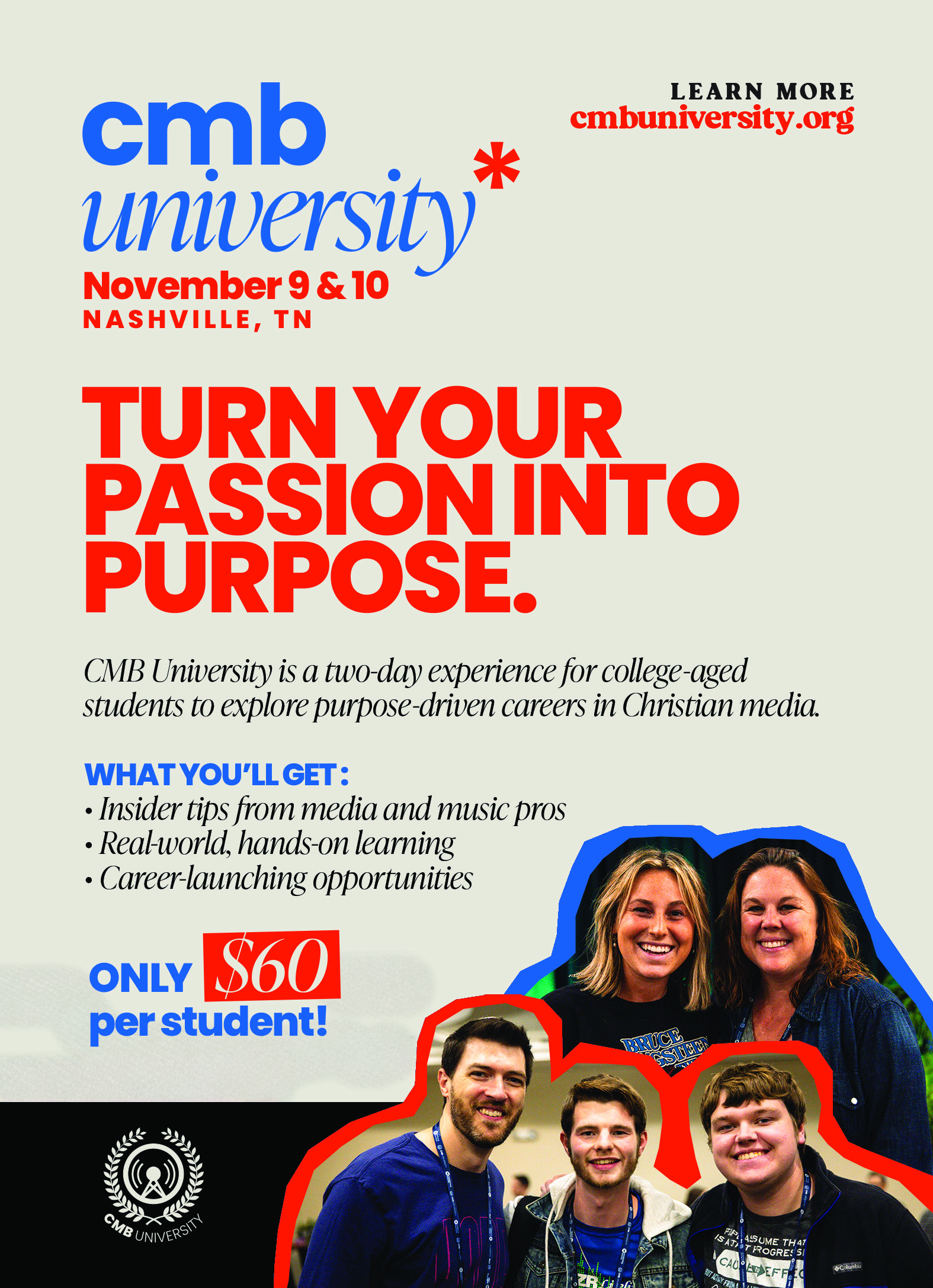 Since 2019, CMB University has been a gateway for college-aged students who feel called to Christian music and media, providing them direct access to the industry and its leaders. This year’s event takes place November 8 & 9 in Nashville: a two-day, hands-on experience designed to inspire, educate, and equip future professionals.